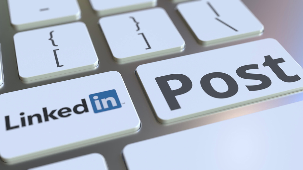 LINKEDIN company logo and Post text on the keys of the computer keyboard, editorial conceptual 3D rendering